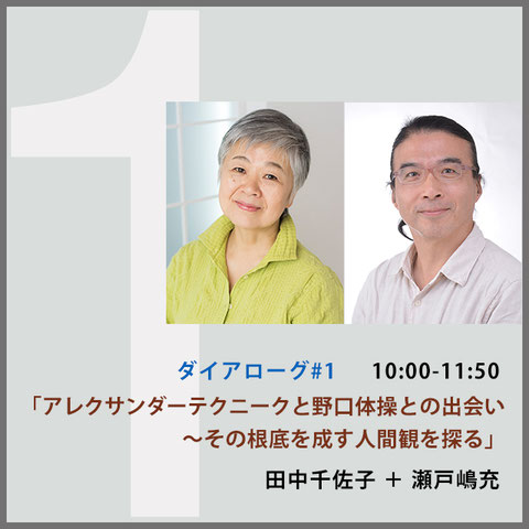 田中(AT)も瀬戸嶋(野口体操)もそれぞれの師の実践を承けつぎ、長年にわたって指導・研究を続けて来たものです。現在は師からの学びの発展として、それぞれに独自のワークを行っています。現代という時代の中で、年月をかけてATと野口体操が田中と瀬戸嶋の中で、どのように発展し進化して行ったか。ダイアローグは講師二人の現在のワークをお伝えする場にもなることでしょう。